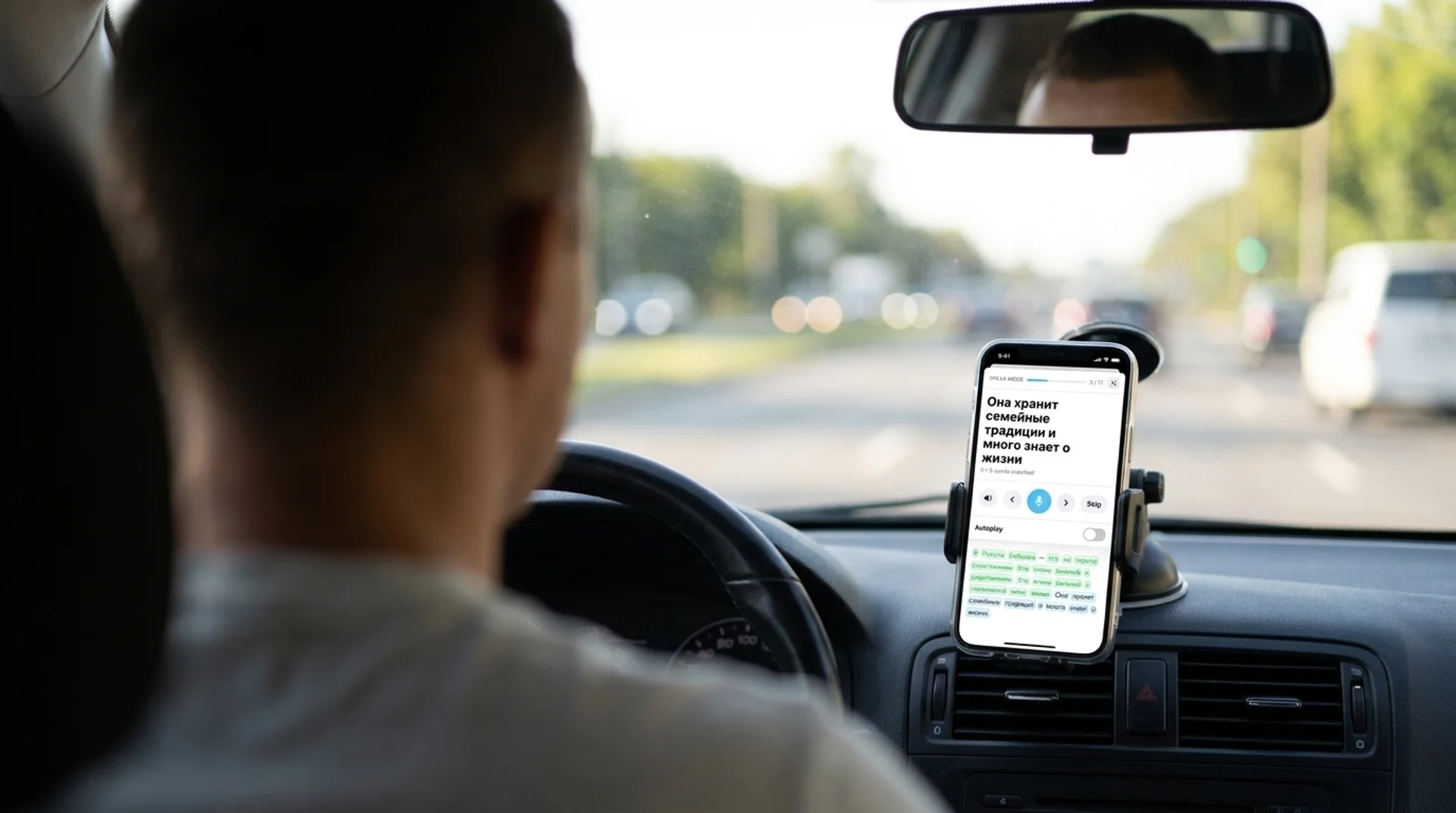 The idea is simple: after reading a sentence, you should also be able to say it out loud, copy its rhythm, and mimic the way it sounds. Reading helps you recognize words. Speaking helps you make them yours.